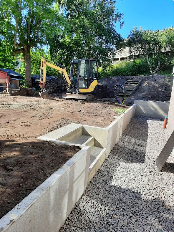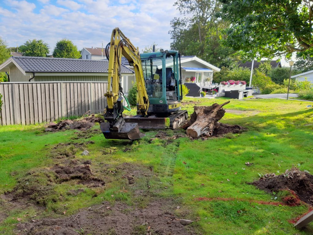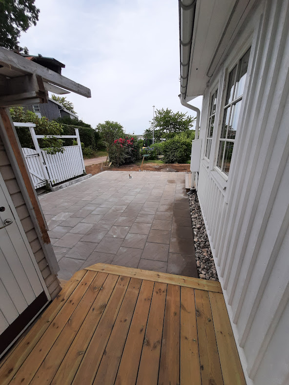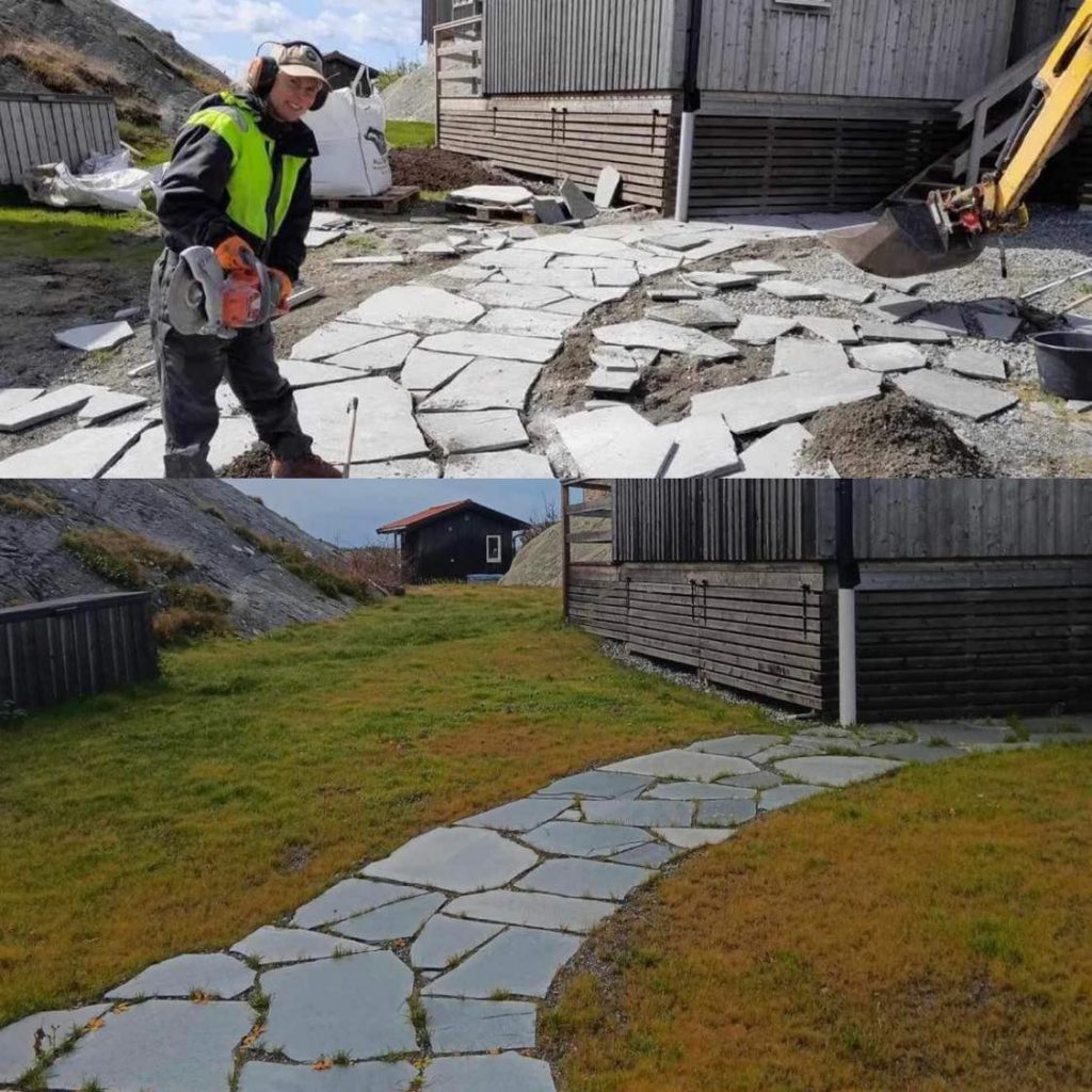 Här blev det en skiffergång till gäststugan Liten mur av L-stöd samt en platsgjuten trappa ny trall, dekorsten samt uteplats av betongstenVi kan tex effektivt ta bort stubbar och sten i er trädgård